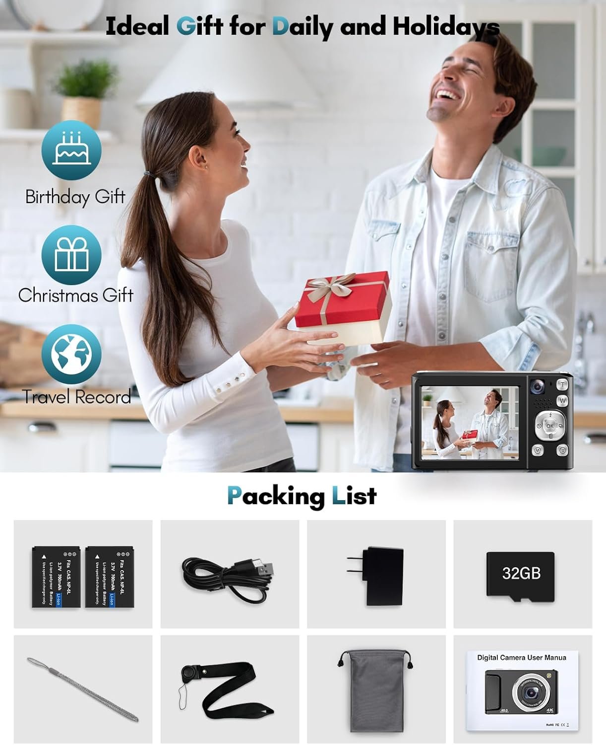 【48MP Dual-Lens Digital Camera, Easily Record Your Travels!】This digital camera uses the latest CMOS image sensor system, allowing you to easily capture stunning 48MP HD images. Equipped with dual lenses, it enables one-touch switching between selfies and landscape photos without the need for assistance. Even beginners can take amazing photos of people, scenery, selfies, and more during their travels!