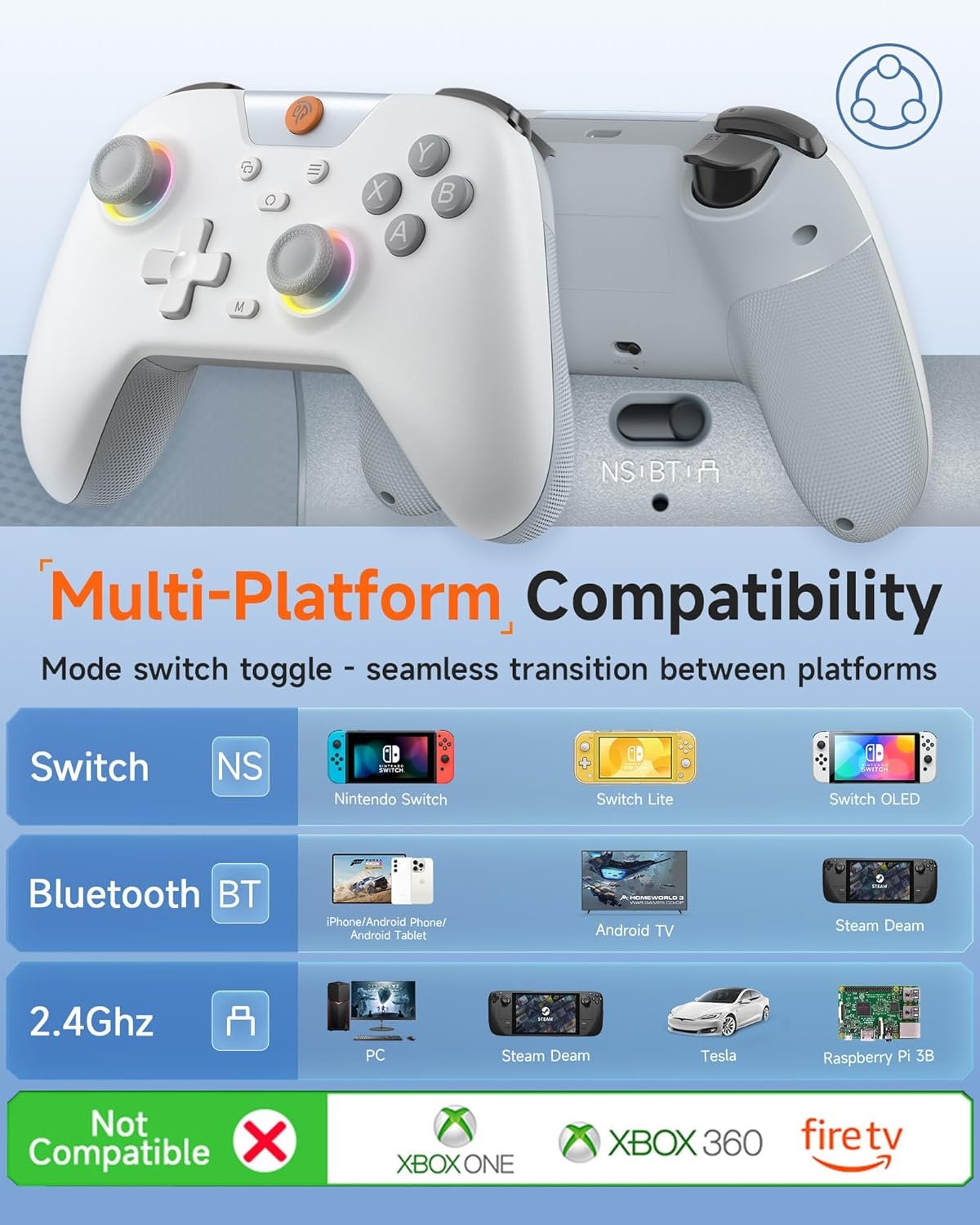 🎮【RGB Light】 The X05 game controller features RGB lighting effects, allowing you to change the lighting to your preferences and creating an immersive gaming experience.