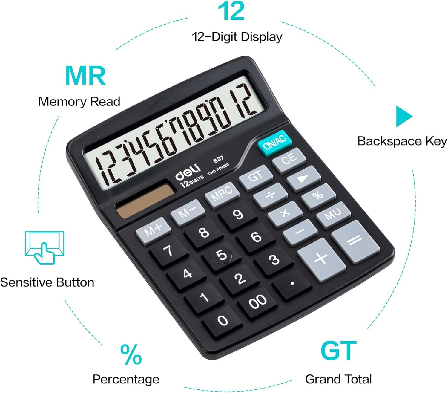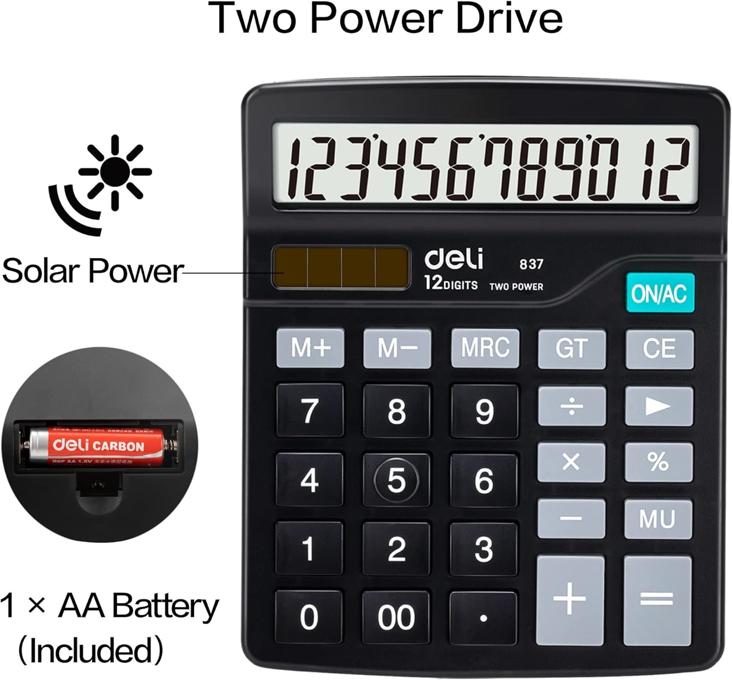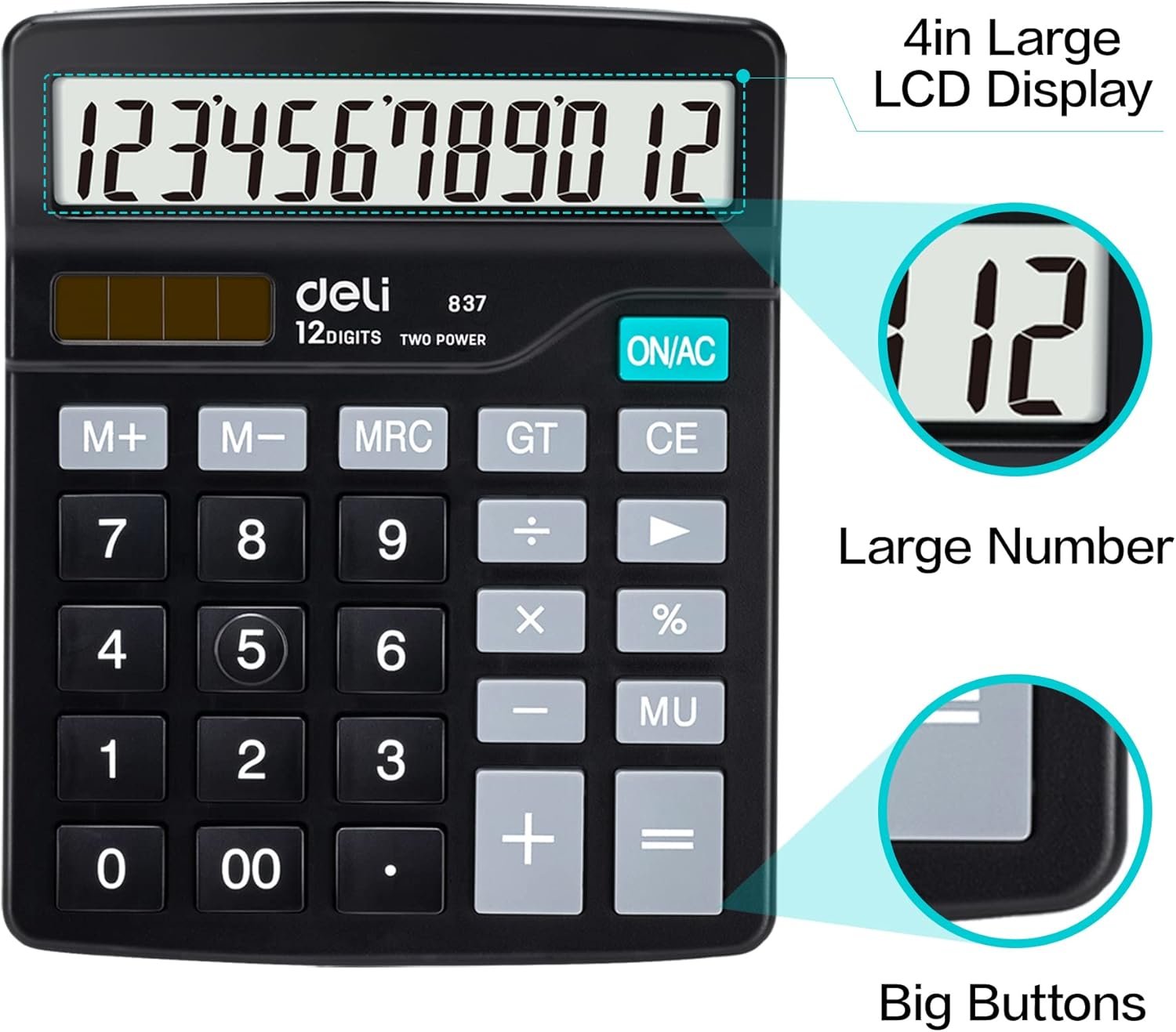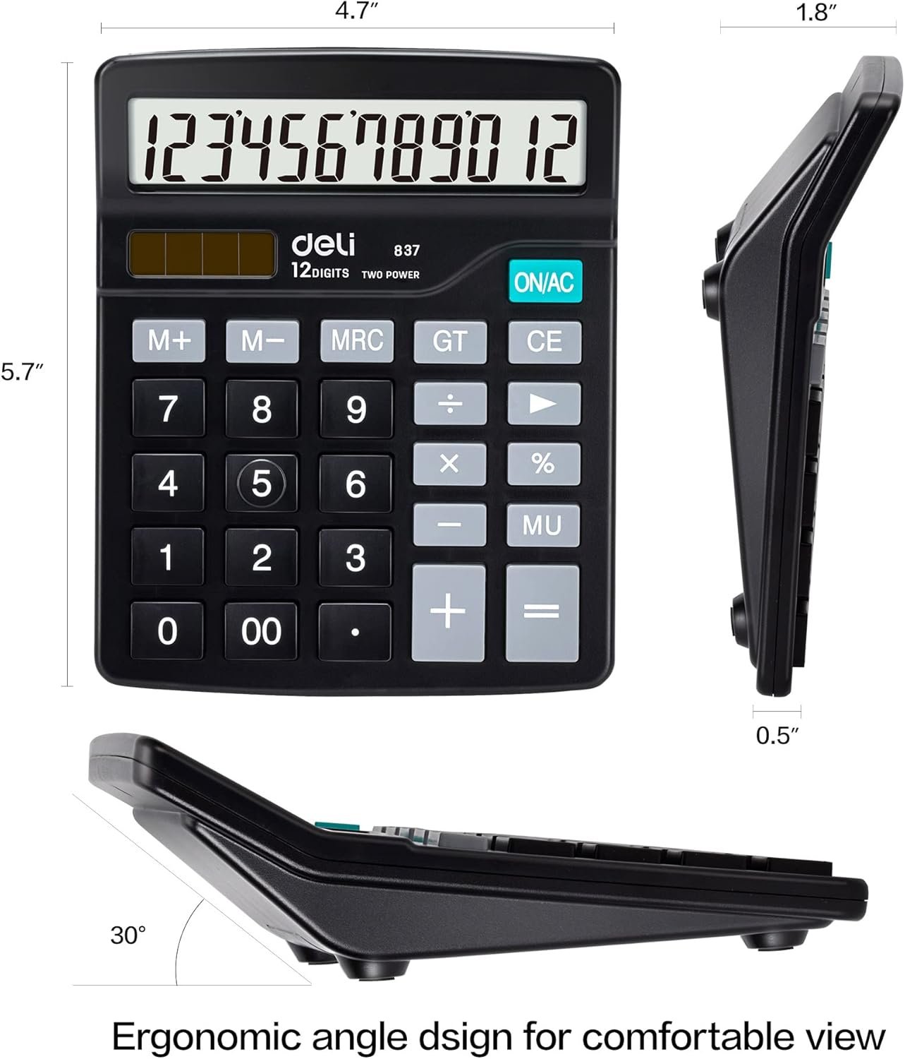 Calculator, Deli Standard Function Desktop Calculators with 12 Digit Large LCD Display and Sensitive Button, Solar Battery Dual Power Office Calculator, Black