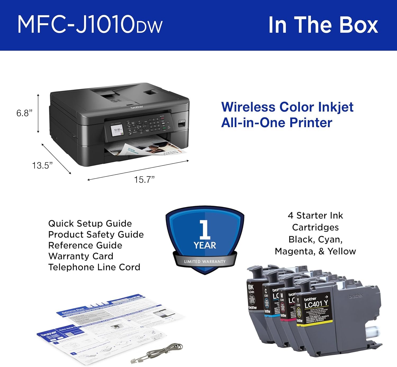 The Brother MFC-J1010DW color inkjet all-in-one printer is ideal for your home, home office or small office. Delivers robust features and business-centric functionality not found in similarly priced inkjet printers plus print up to 17 ppm for black and 9.5 ppm for color(5). Compact and economical, perfect for small spaces and budgets. Includes multiple connection options, including a built-in wireless(3) interface for sharing with multiple network users, Wi-Fi Direct(R), or connect locally via a USB interface. Delivering high quality, reliable printing, copying, scanning and faxing and enabling wireless printing from your desktop, laptop, smartphone or tablet(3). Use the 1.8-inch color display to navigate on screen menus. Featuring the Brother Mobile Connect(1) App, that gives you the freedom to print and manage your printer from virtually anywhere. The MFC-J1010DW also features the unique Brother Page Gauge(2) that estimates remaining page levels, so you always know how much ink you have left. Use the 20-page capacity automatic document feeder or the 150-sheet capacity adjustable paper tray for generous output without constant monitoring. Duplex printing helps save paper, while mobile device printing(3) and Cloud connectivity let you print-from and scan-to popular Cloud services(4) directly from the device. Has a 1-year limited warranty and free online, call, or live chat support for the life of the printer. Works with Alexa.