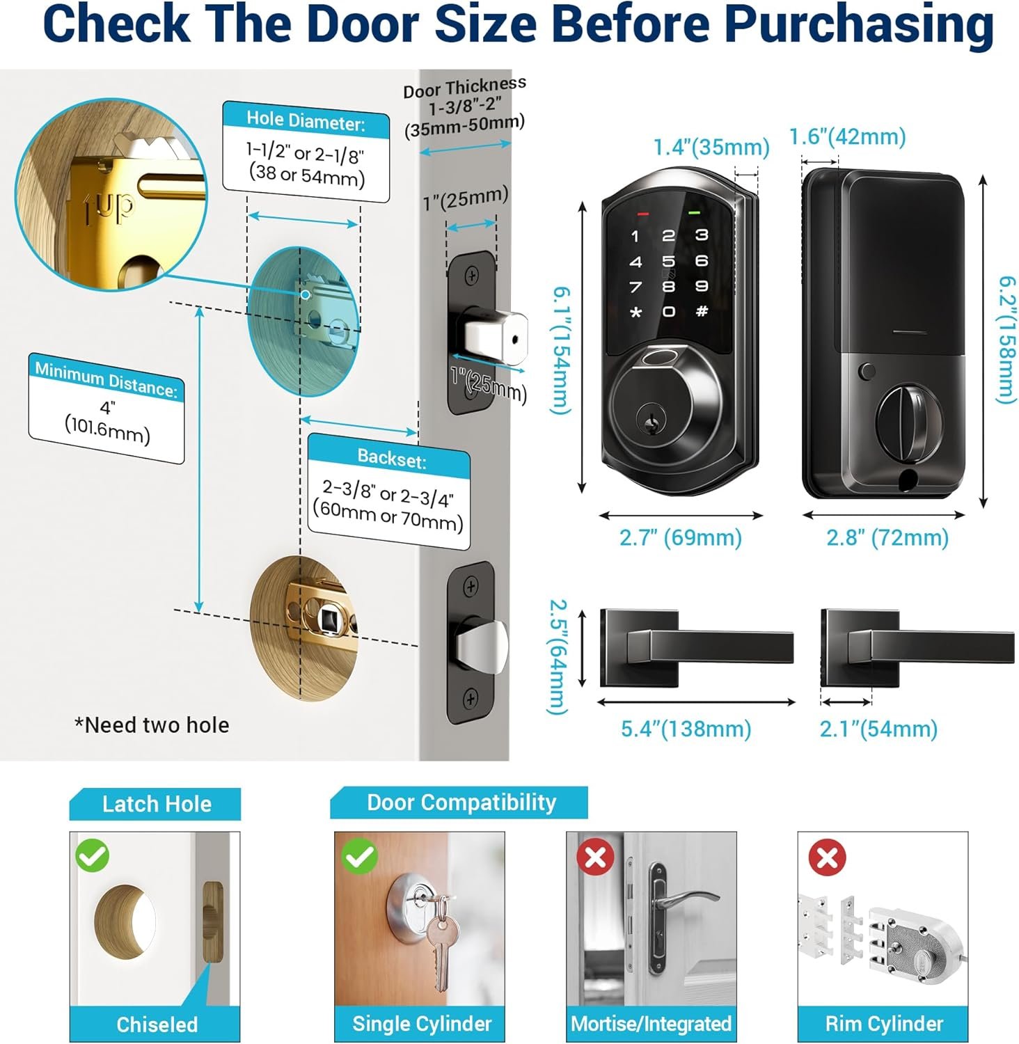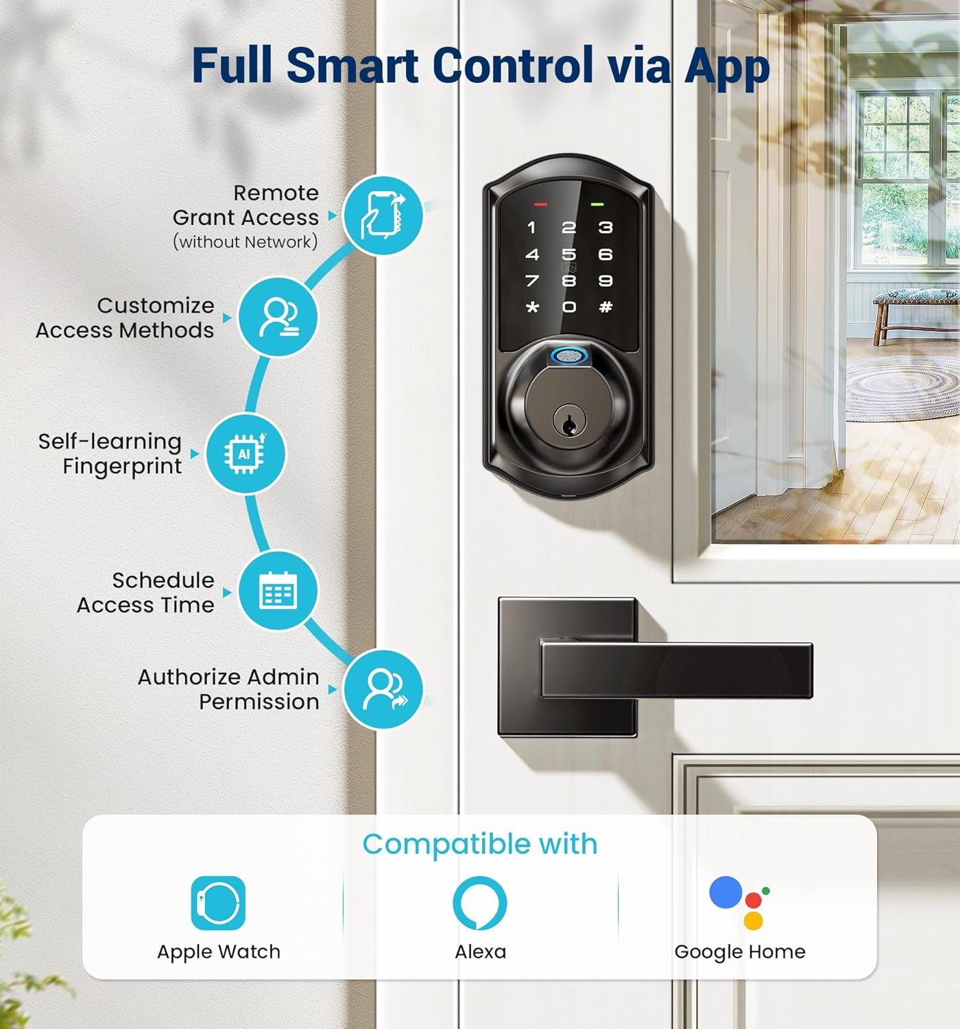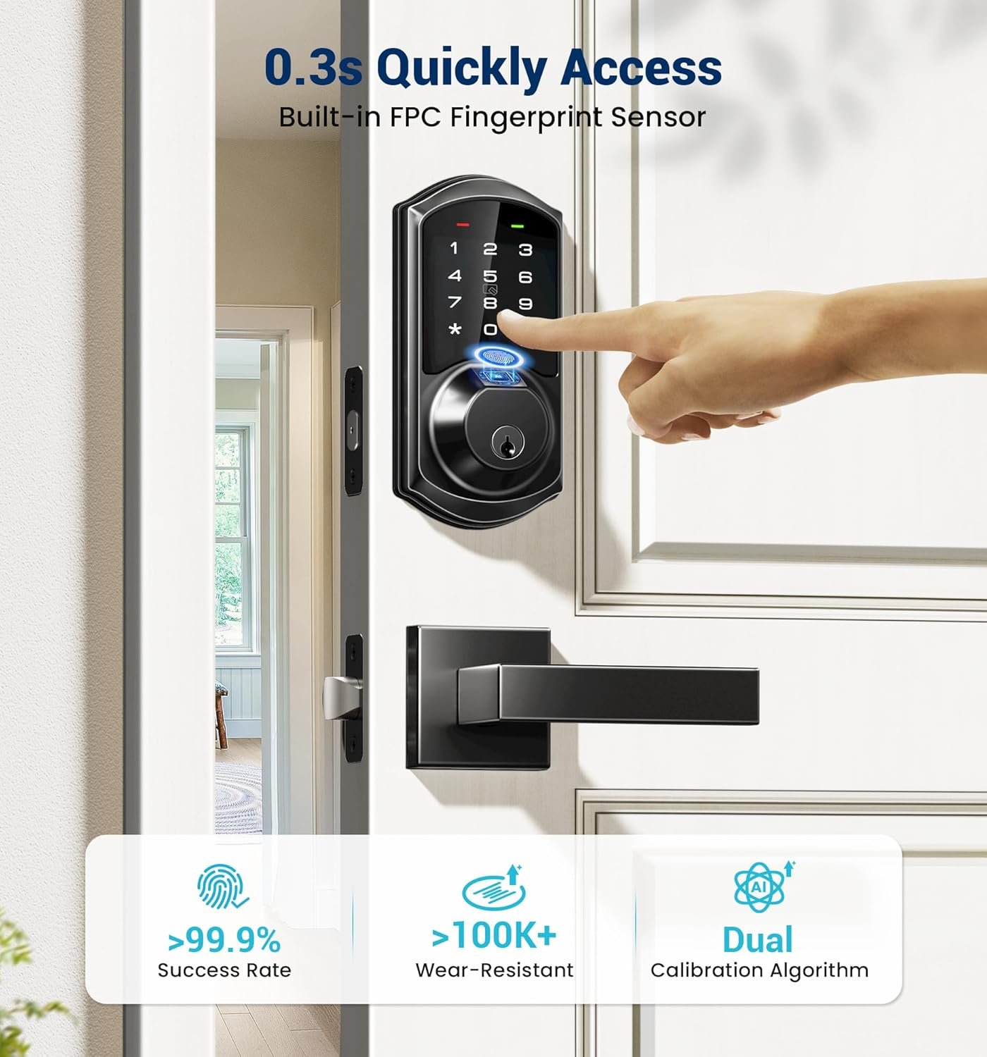 Veise Fingerprint Smart Locks for Front Door with 2 Lever Handle Set, App Control, Keyless Entry, Electronic Digital Keypad Deadbolt, Auto Lock, Waterproof, Easy to Install, Matte Black
