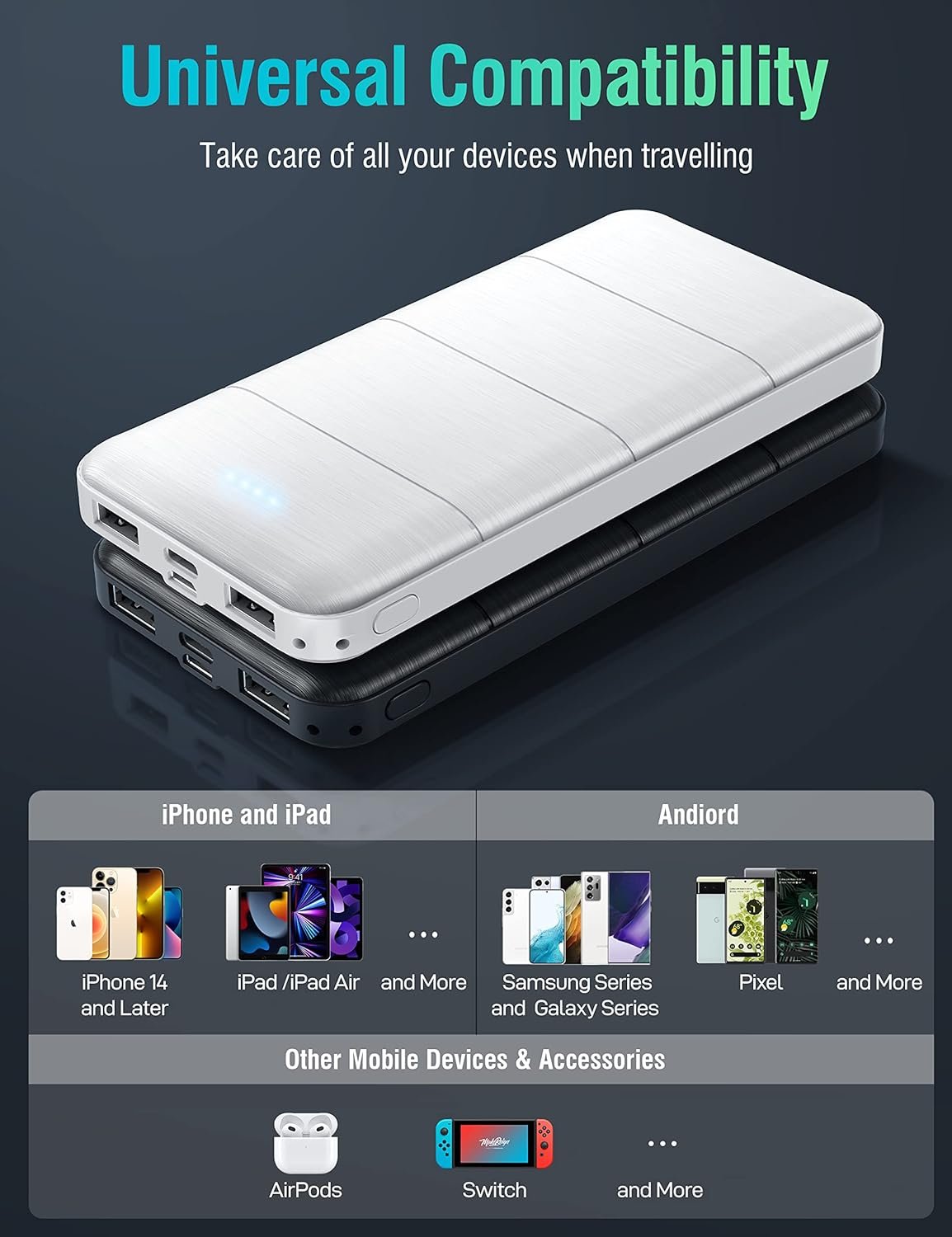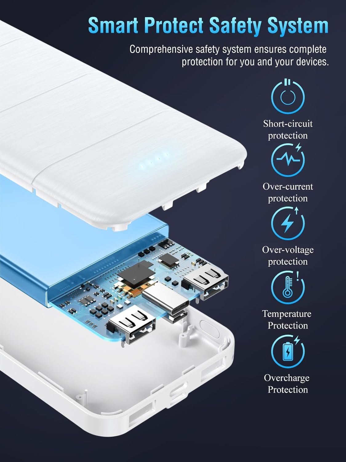 Portable charger Features an intelligent controlling IC, can automatically identify and provide universal compatibility with all devices. It intelligently adjusts the current and voltage to suit each device, effectively preventing overcharging, overvoltage, overcurrent, and short circuits.