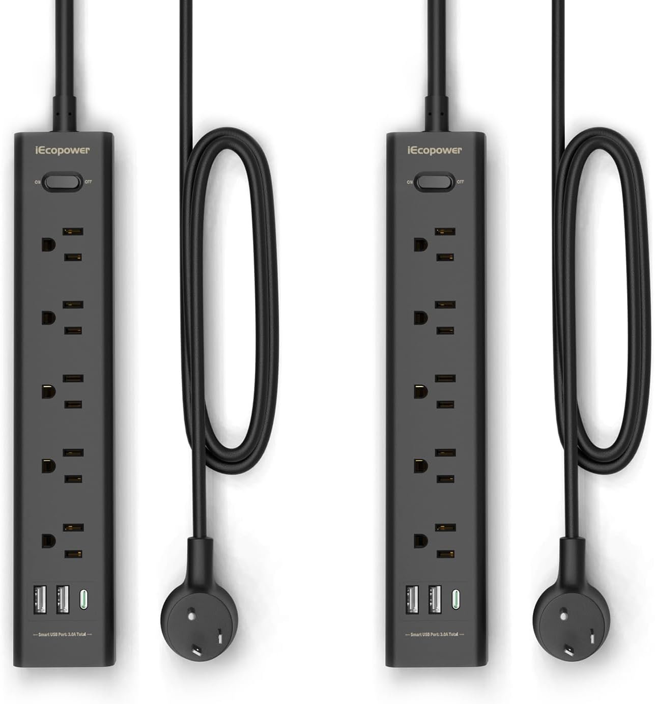 【8-in-1 black surge protector power strip】 – With 5 AC outlets and 3 USB ports(1 USB C Port), this USB power strip can charge up to 8 devices simultaneously with no more than 1250W/10A. The built-in smart IC chip automatically adjusts and provides optimal charging speed for your electronic devices with USB power output up to 2.4A/port, USB-C port Output 5V/3A MAX, 15W total。